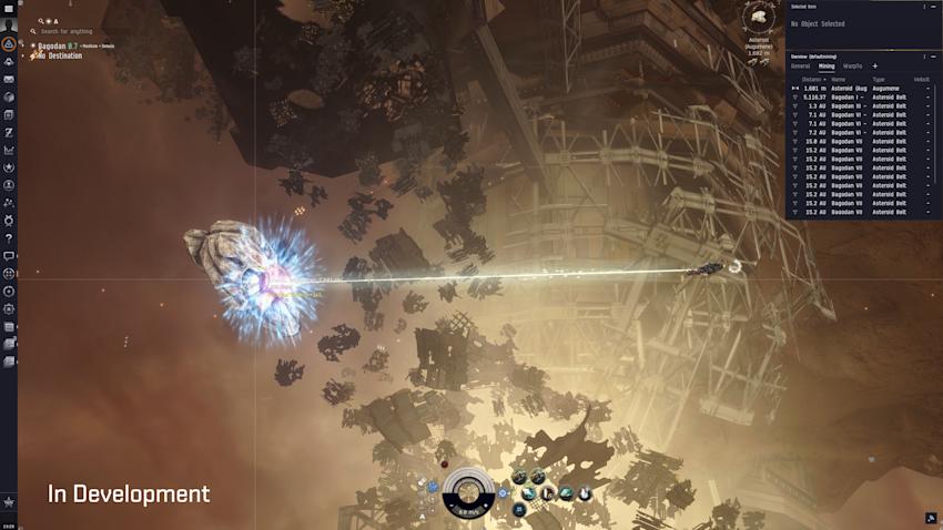 When warping into asteroid belts and mining anomalies, a new introductory message will appear in the bottom third of the screen that lets players know the name of the location they just arrived at, as well as an estimate of how depleted or fresh the asteroid field is. This should be especially helpful to players in high-traffic space to indicate at a glance whether a field is mostly picked clean by other players or not.